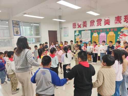 同期,王珏珺老师带来音乐课例《彝家娃娃真幸福》,打破传统听唱教学模式,将“具身认知”理念深度融入课堂。课堂中,学生不再是单纯的“听众”,而是通过拍手打节奏、跺脚踩节拍、模仿彝族舞蹈简单律动等方式,以身体为“媒介”感受音乐节奏与情感。在“阿哩哩”的欢快歌声中,学生化身“彝家娃娃”,在协作律动中触摸民族音乐的魅力,生动诠释了“身体是认知中心”的理念,有效激发了学习兴趣与音乐表现力。